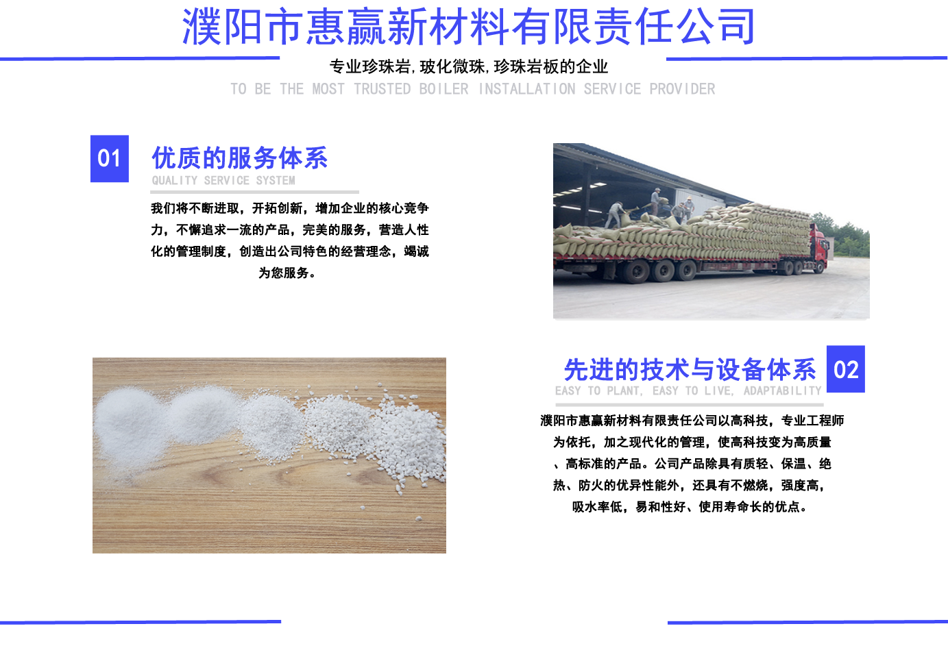 濮陽市惠贏新材料有限責任公司是一家專業生產保溫材料的廠家,位于范縣王樓鎮工業區,專業生產珍珠巖、珍珠巖保溫板、?;⒅榈缺亟ú?,主要用于外墻保溫、屋面保溫、園藝等領域,產品暢銷國內外,深受客戶一致好評。我們擁有優秀的產品和服務,在成立以來都以誠信對待客戶!      公司擁有各類專業人才,技術人員50人,運輸40人,專業的十多輛運輸車輛。產品銷售網絡遍及國內20多個省市,十幾年來,通過公司的不懈努力和誠信經營理念,產品質量可靠,價格合理,深受廣大客戶認可和好評!      我公司本著以客戶為本,客觀實際,創新發展的原則,在追求完美極致的道路上努力打造行業新標準,我公司憑借卓越的產品質量、完善的服務標準、良好的口碑信譽、竭誠歡迎廣大客戶前來洽談業務!...